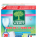 Las pastillas L'Arbre Vert para lavavajillas son solubles en agua además de todo en uno, certificadas por la etiqueta ecológica europea, limpian, desengrasan y conservan eficazmente el brillo natural de sus platos.
