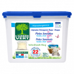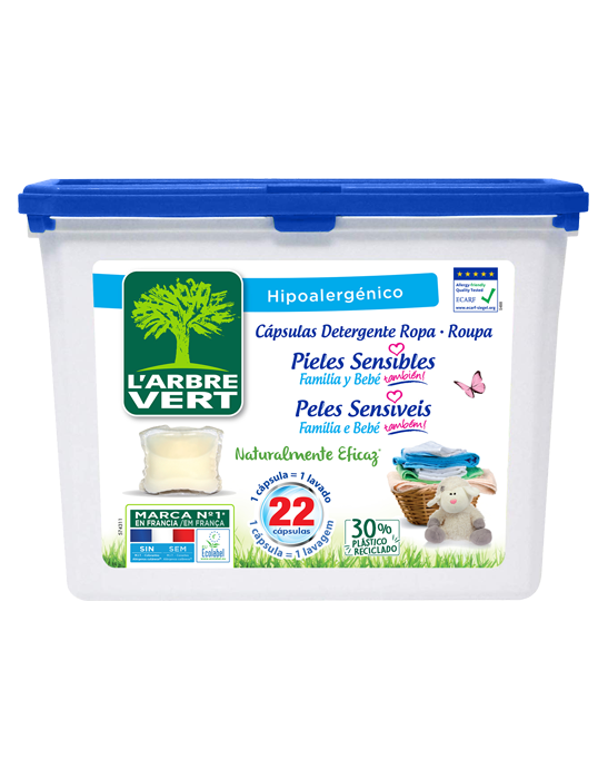 La dosis de detergente en cápsulas de L'Arbre Vert Piel Sensible permite que la ropa del bebé se limpie regularmente, al mismo tiempo que la de toda la familia, minimizando al máximo el riesgo de irritación. Envuelta en una película totalmente soluble en agua a 30°C, la dosis libera sus ingredientes activos tan pronto como comienza el lavado, para asegurar una eficacia óptima respetando las fibras de la ropa, sin dejar residuos en los tejidos o en la máquina.